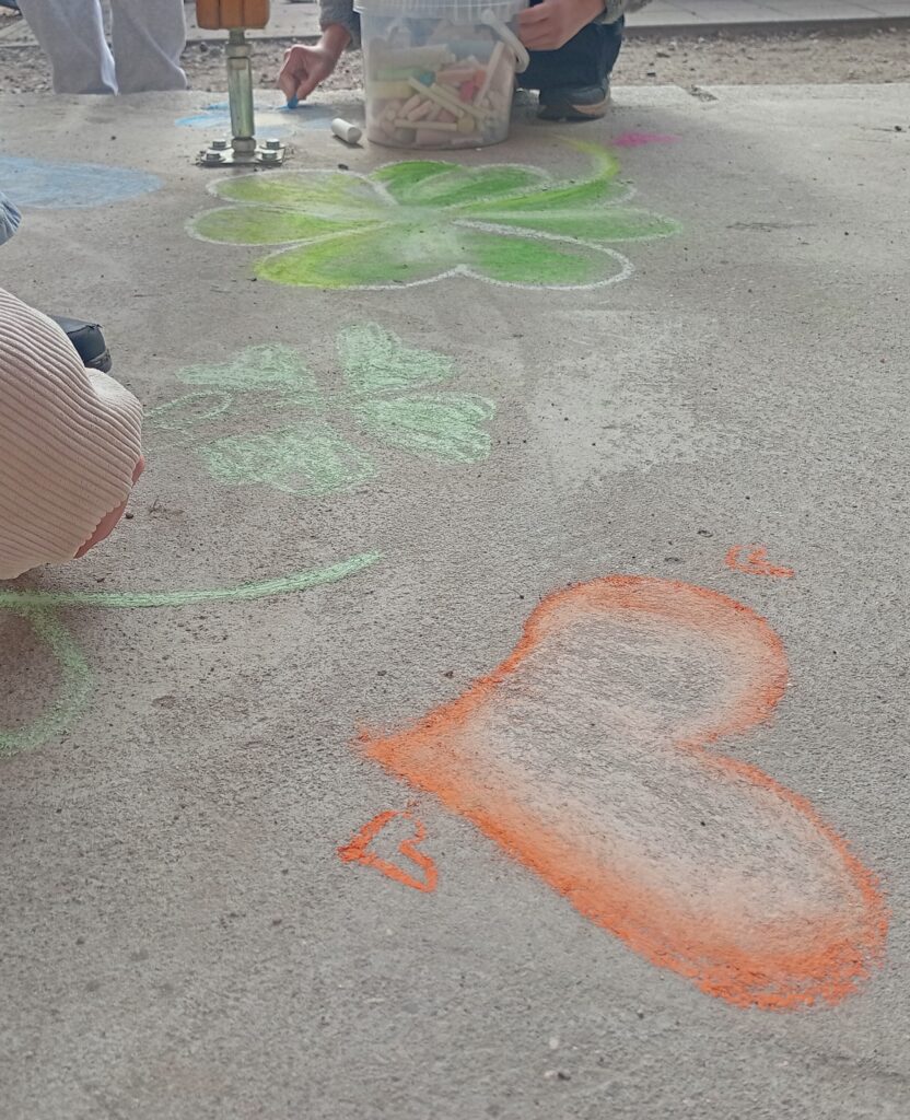 Die Bank der warmen Worte war umgeben von bunten Kreidemotiven. Und kleine interaktive Aktionen luden jede*n ein, dabei zu sein.